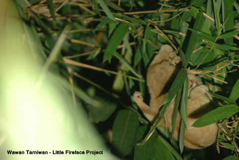 Searching for our favourite loris super mother Tereh with local wildlife photographers Wawan Tarniwan and Muhammed Taufik and our head tracker Dendi Rustandi, we were lucky to see her ‘exposed’ right at the front of the bamboo…but she was not alone! With her was our roaming male Azka, who we thought was a faithful partner to One Eye…but when a loris is about to enter her brief window of ‘sexy time,’ it was clear that Azka was not in the mood for being faithful!
