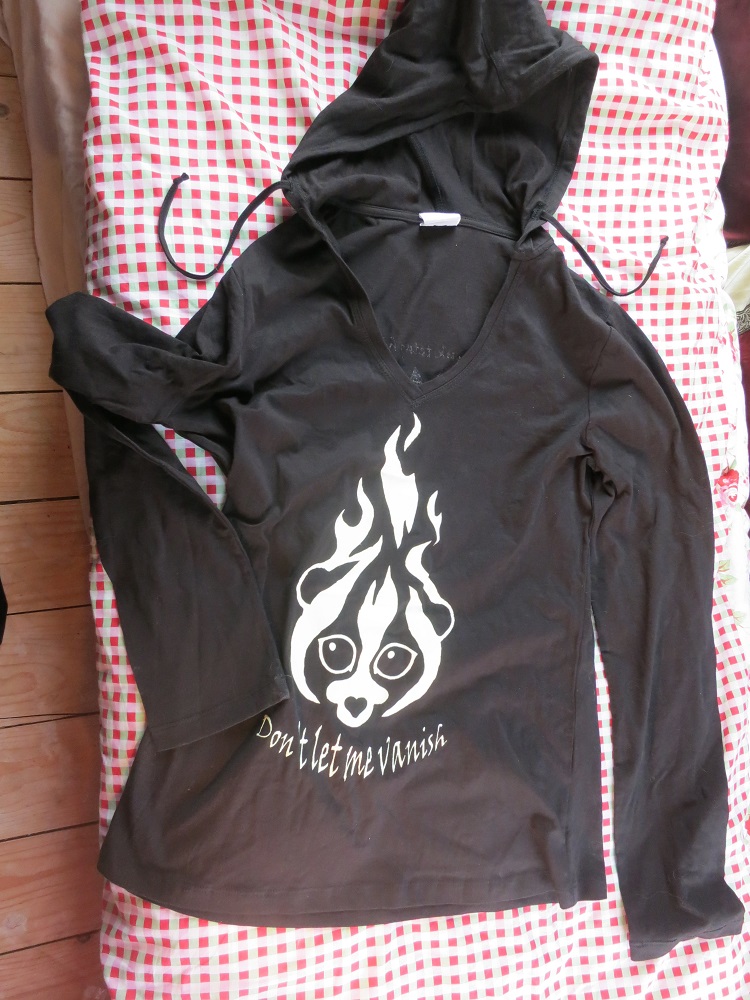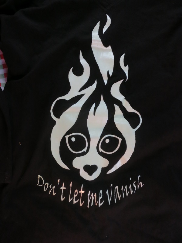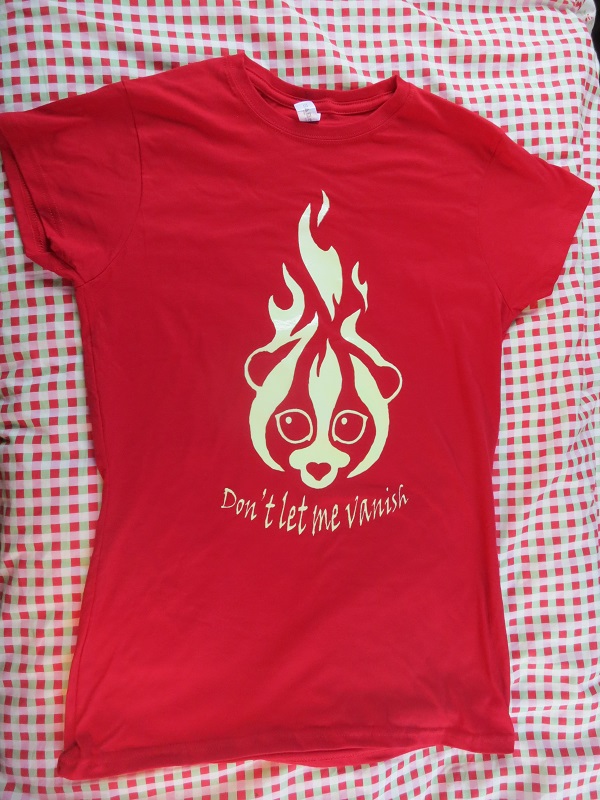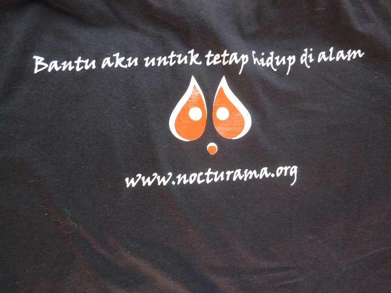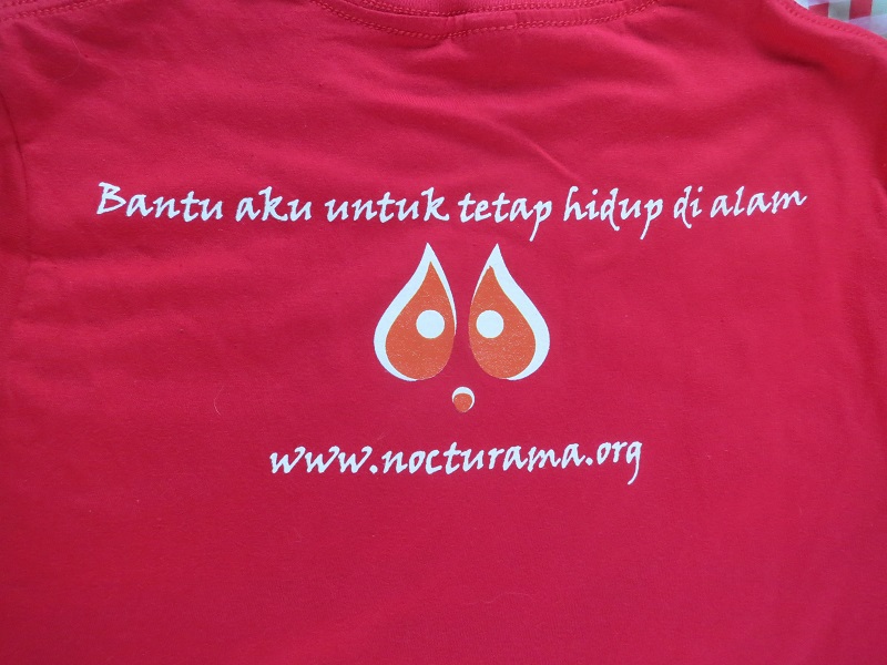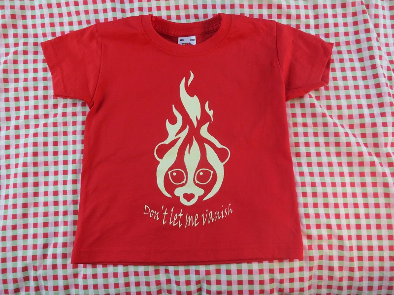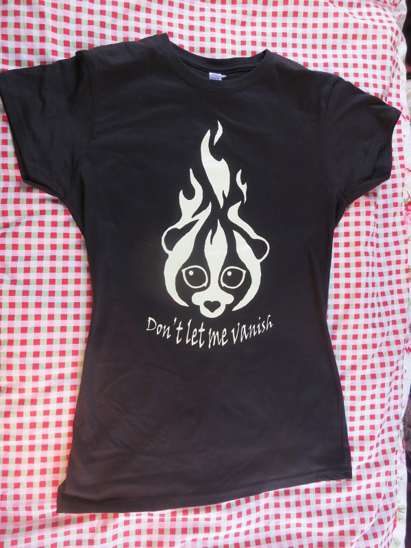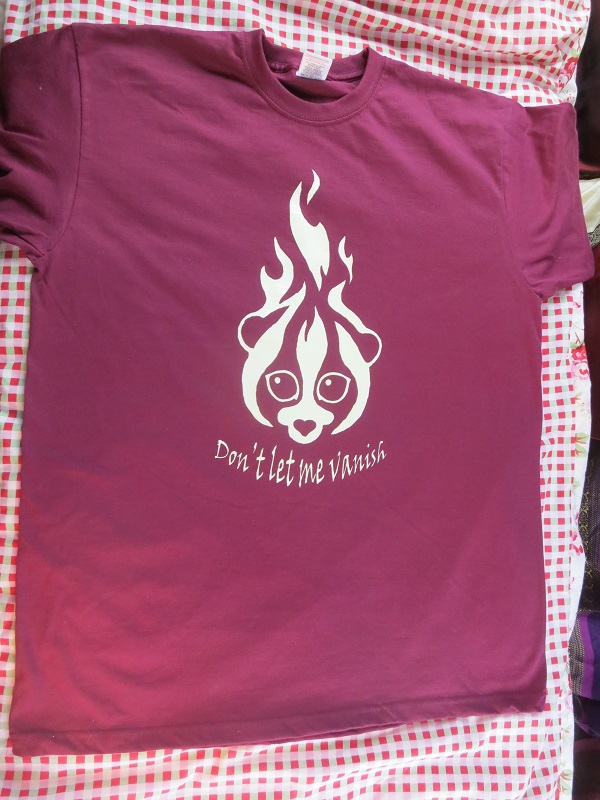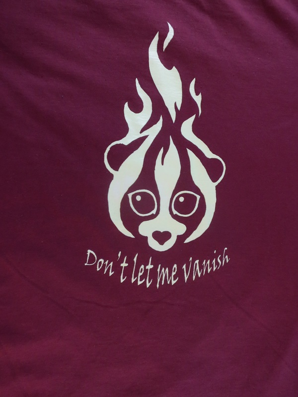 Our Flame Logo was designed by Helga Schulze. It is to represent the plight of the loris, be it perishing due to burning of forest for oil palm, burning in the hot streets when being sold as a pet, or burning in the bright lights of someone’s living room when forced to live as a pet. All shirts glow in the dark! The saying is in Indonesian and English – Don’t Let Me Vanish.
