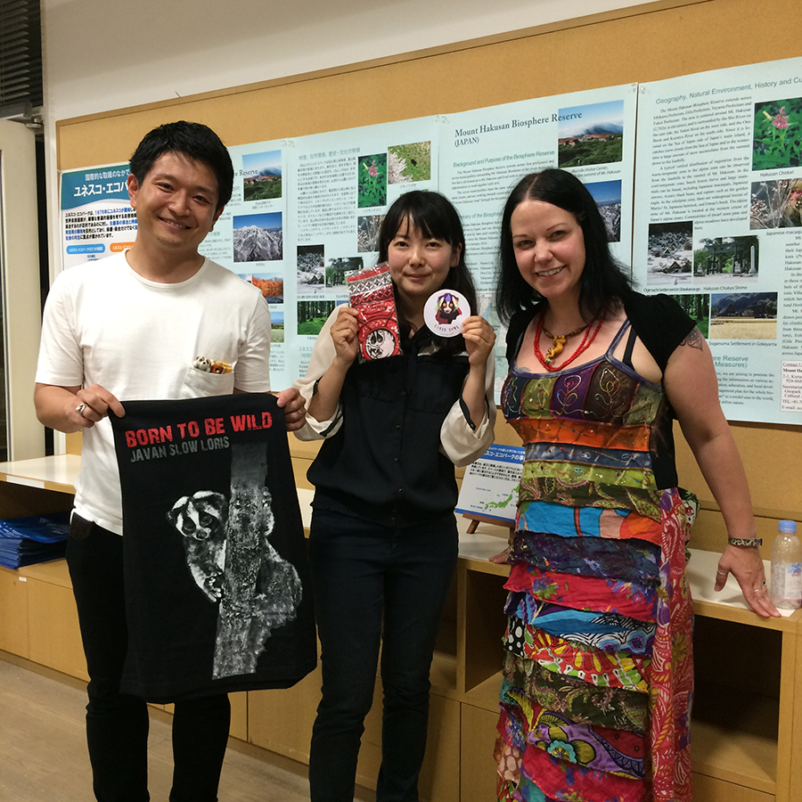 This June, Prof. Anna Nekaris of Oxford Brookes University visited Japan to enlighten us to conserve slow loris and do inspect the slow loris pet trade. She gave 5 lectures at Tokyo, Inuyama and Kyoto that succeeded very well; I was glad that Japanese citizens could know about the REAL life of wild slow lorises. We appreciate cute animals, but we must know the best way for their happiness. Anna’s lecture educated us how we should have a relationship with wild animals via slow loris.