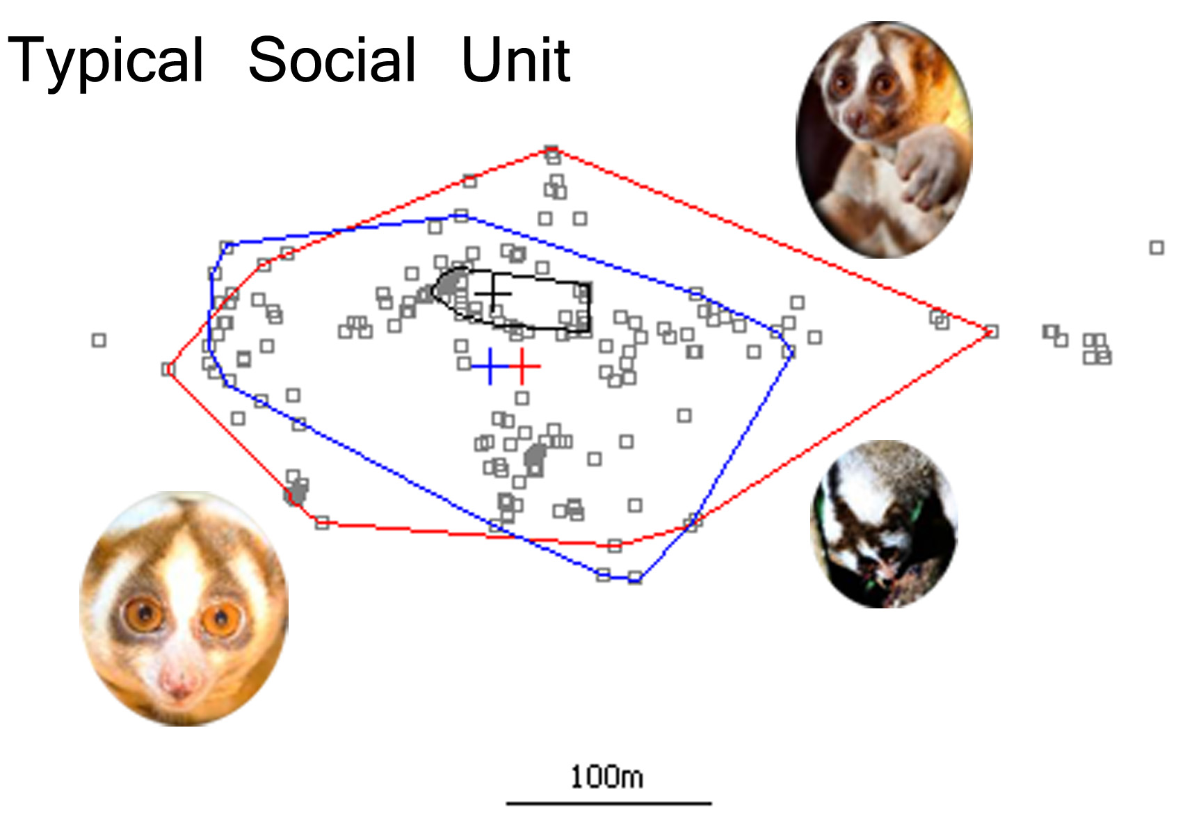 Generally, loris mum, dad and kids live in stable social units or spatial groups. They spend their time allogrooming, following, expressing alternate click-calls and whistles and sleeping in close contact, with parents sharing the shopping responsibly by transferring information on food resources.