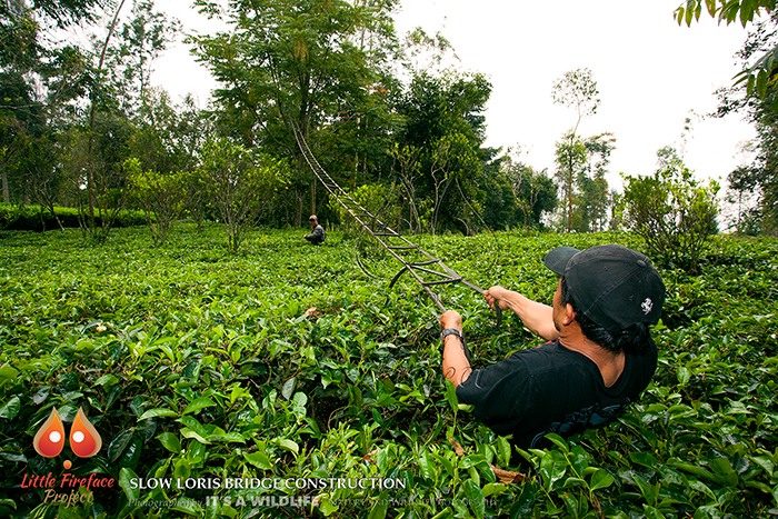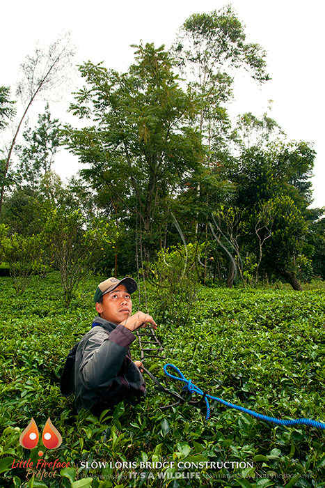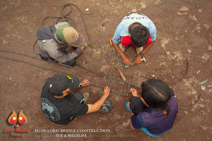 After the sad death of our beloved loris Tahini, I (Denise Spaan) decided we had to do something to make sure the same would not happen to any other lorises. As the Javan slow loris is Critically Endangered we really can’t afford to lose any! And so the idea came to build loris bridges. Thanks to the kind donations of everyone over the Christmas period and the sale of the adoption packs February saw the first bridge go up. It is one thing having an idea, but seeing it become a reality is something else. I was so proud of the hard work of the LFP team and the result was astouding. A strong bridge that connected two trees in Api’s area. Api lives on a football field and the connectivity between her cozy bamboo sleep site and the other trees in the area is minimal. To make sure she doesn’t have to go to the ground to cross, we connected the two trees. Now all the remains is to see whether she is going to use it!
