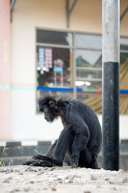 Such thoughts inspired me to make some educational materials from photographs taken by Andrew Walmsley during our recent trip to Java. (Please see the education pages). In particular, we saw the most sorrowful ebony langur – a threatened monkey endemic to Indonesia. For a few moments his owner came out and released the chain that kept him tethered to a post. The monkey looked out for comfort, the owner smiled. What a lovely happy YouTube video that would make. Within seconds, growing tired of his plaything, the monkey was chained again to the post to breathe in the fumes of traffic, to sit alone, and to eat bananas and rice – a diet wholly unsuitable to an animal fully adapted to eat leaves.