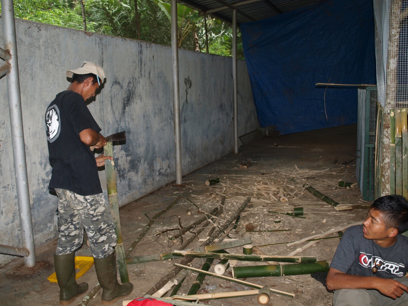 Keeper Yoko is new to caring for lorises and our tracker Aconk was wonderful at explaining things we have learnt from the wild. For example, we have recently discovered that our lorises love sleeping in thick bamboo/foliage and therefore we refurbished the enclosures to include lots of bamboo arranged close together so the lorises can ball up in it!